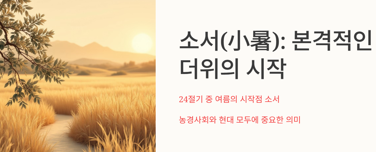 우리 조상들은 자연의 흐름을 24절기로 나누어 계절의 변화를 세밀하게 표현했습니다. 그중 여름절기에 해당하는 소서(小暑)는 본격적인 무더위가 시작되는 시점으로, 농경사회에서 매우 중요한 의미를 지녔습니다. 오늘은 소서의 정의, 뜻, 그리고 역사적 유래와 풍속에 대해 깊이 있게 살펴보겠습니다.